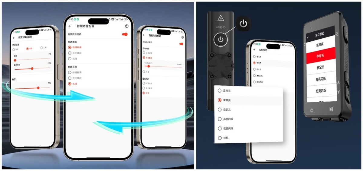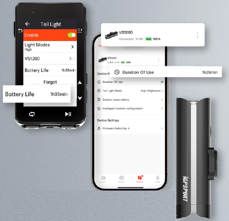 iGPSPORTのサイクルコンピューターと同期させることにより、VS1200に内蔵された加速度センサーと環境光センサーを駆使して、効率的な作動や自分好みにカスタマイズすることができます。ライド中はVS1200の電源に触れることなく、加速度センサーが自転車の動きを感知し、周囲の環境が変われば自動でライトが点灯/消灯します。