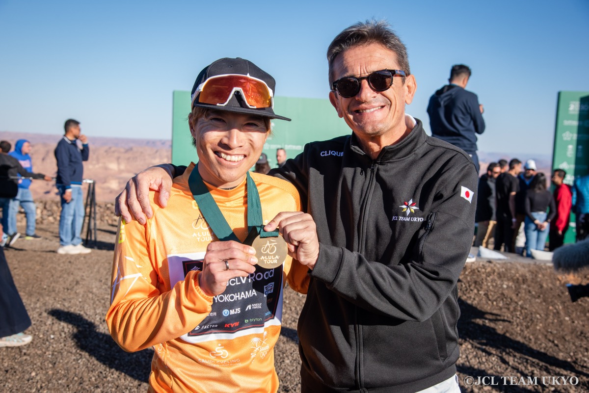 岡 篤志(JCL TEAM UKYO)が、サウジアラビアで開催のアルウラー・ツアーに参戦。5日間のステージレースのステージレースでモーストアクティブライダー賞(一般的にはポイント賞)を獲得、総合優勝のサイモン・イェーツ(ジャイコ・アルウラー)とともに表彰台に立つ快挙を成し遂げた。