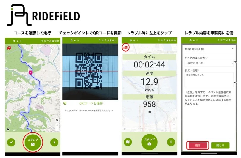 本イベントは、サイクリングアプリ「RIDEFiELD(ライドフィールド)」を使い、参加者があらかじめ決められた時間内の好きなタ イミングで各自スタートするフリーライド形式です。コース上のチェックポイントでライドの様子をSNSに投稿することが完走条件となっており、現地から走行中の生の声を発信していただきます。見事完走された方には、記念品をプレゼントいたします。
