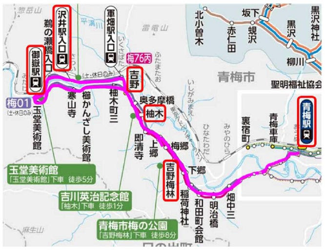 青梅駅前、吉野梅林、柚木、吉野(青梅駅方面のみ)、沢井駅入口、御嶽駅前