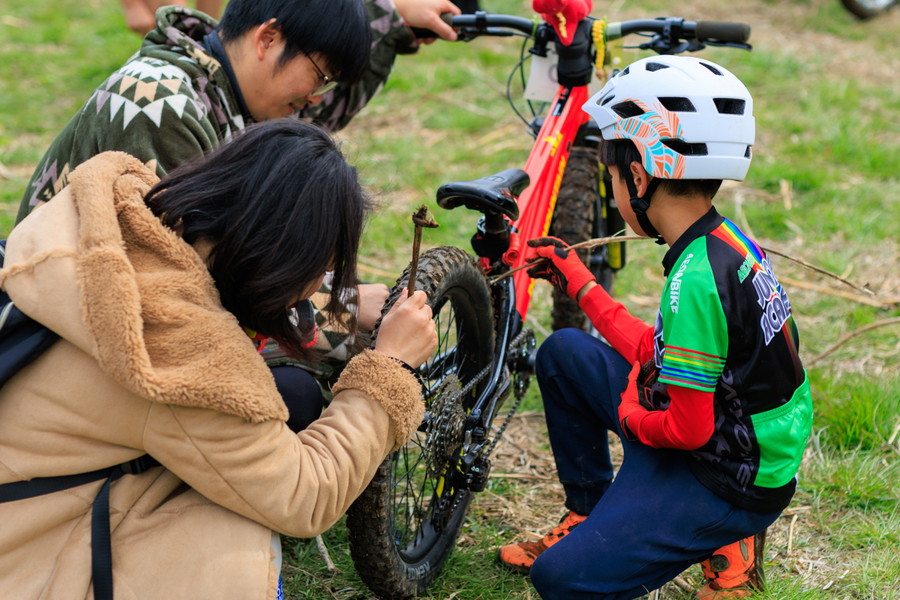 幅広い年代・レベルの選手が参加するということもあり、キッズレースでは安全面を重視し、ヘルメットのあごひも確認や代表選手といっしょにコース試走を実施。1時間エンデューロを走っていたライダー、山崎雅典(champion system)と佐藤誠示(SAGE’S STYLE)が先導するかたちで、危険なポイントなどを確認しながら子どもたちといっしょに試走を行った。