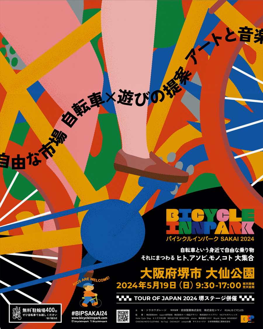5月19日(日)、大阪府堺市の大仙公園で自転車&遊びを提案する自由な市場「BICYCLE INN PARK(バイシクルインパーク)」が開催される。国内最大規模のロードレース「Tour of Japan(ツアー・オブ・ジャパン)」堺ステージの併催イベントとして行われ、自転車以外にもさまざまな催しが用意されている。以下、プレスリリースより。