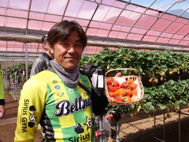 ビューポイントからしばらく走るとヤビツ峠に入った。ここから蓑毛ベリー農園まではダウンヒルだ。旧デイリーストア手前の路地の先に広がるいちご農園では、4種類のいちごを摘んで品種ごとの味の違いを楽しんだ。ベリー農園を後に、さらに横道に入ると2回目のサプライズ。川沿いに満開の桜並木が続いている。