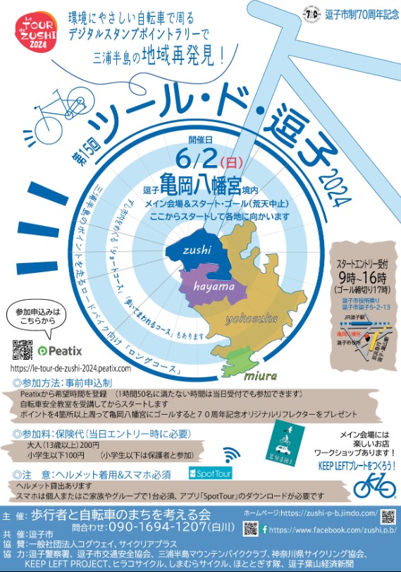 例年150名ほどの参加者が思い思いのペースで楽しんでいるこのベントは、逗子と近隣のポイントを巡る10km程度のコースや、太平洋岸自転車道を利用した三浦半島を巡るロングコースなど、自分でポイントを選んでそれぞれのレベルに合った好きなコースを設定できるのが特徴。今年からアプリ「SpotTour(スポットツアー)」を使用し、スタンプラリー形式でポイントを集める形式になる。