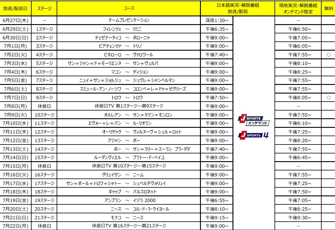 J SPORTSでは、ツール・ド・フランスの開幕を記念し、より多くの方に世界最大の自転車ロードレースの興奮をお届けするために7月2日(火)第4ステージをJ:COM及びスカパー!で無料放送、「J SPORTSオンデマンド」で会員無料LIVE配信、7月7日(日)第9ステージをJ:COM及び一部のケーブルテレビ局ならびにスカパー!で無料放送、J SPORTSオンデマンドでの会員無料LIVE配信に加え、「J SPORTSサイクルロードレースYouTube公式チャンネル」でも無料LIVE配信する。また、大会前日には「ツール・ド・フランス第0ステージ~あと24時間で開幕SP~」として直前情報をグランデパールの地イタリアからの中継を交えて放送。