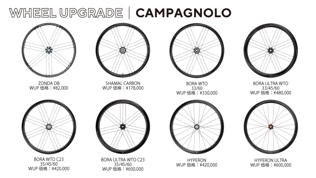 それぞれの完成車標準ホイールから、お得な価格で上位グレードのホイールへアップグレードが可能だ。WUPプログラム適用後の完成車価格はピナレロジャパンの各モデルページで確認できる。
