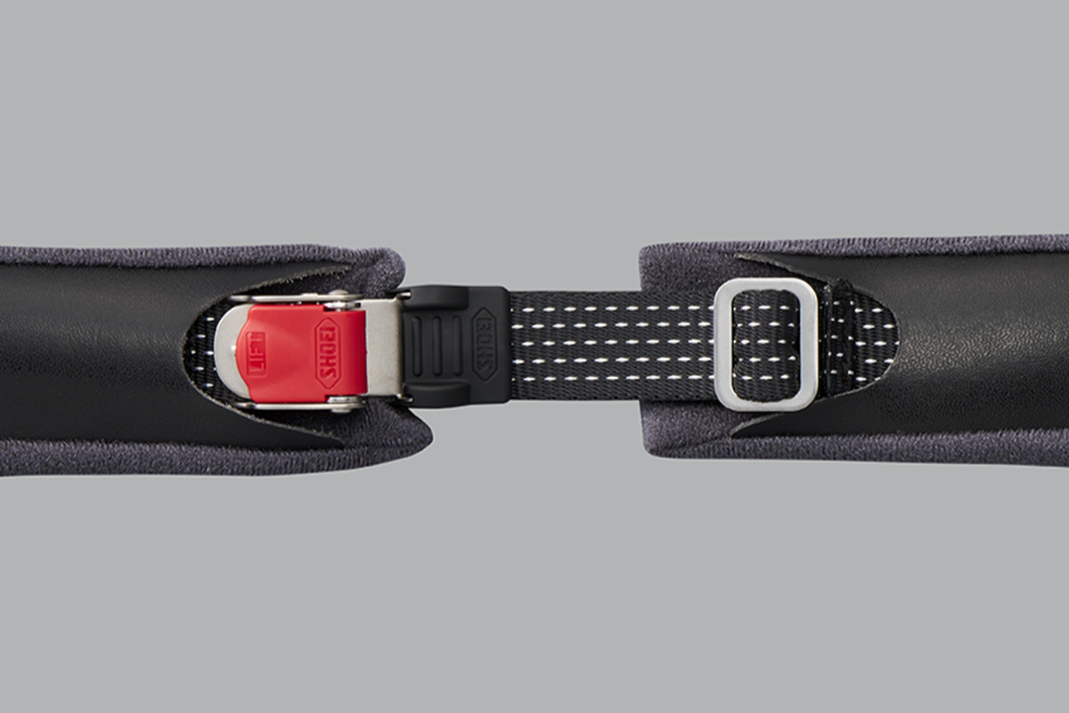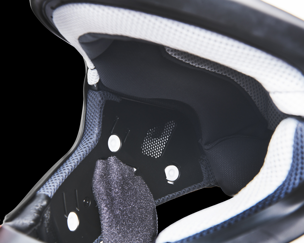 オフロードバイク用ヘルメットにも採用されるSHOEI独自の「M.E.D.S.(Motion Energy Distribution System)」を搭載。インサートライナー中央にある突起を中心にインサートライナーがスイングすることで転倒時の回転加速度を低減し、軽量性や被り心地を損なうことなく安全性を向上させている。