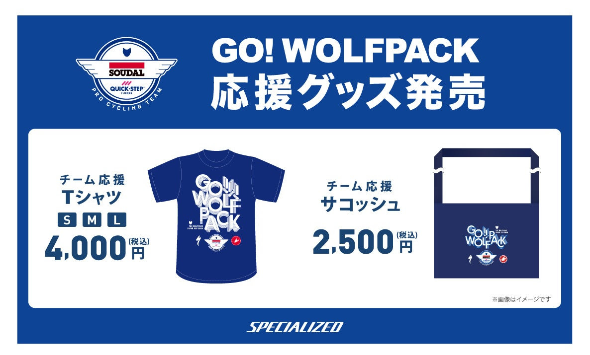 各会場で販売される「GO! WOLFPACK」応援グッズは、スーダル・クイックステップのチームカラーに合わせた青色で統一されている。チームTシャツやサコッシュなどがラインナップされており、レース観戦をさらに楽しむためのアイテムとして要注目だ。