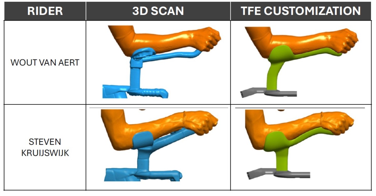 「ここで紹介するチーム・ヴィスマ・リースアバイクの2選手、ワウト・ファンアールとステフェン・クライスヴァイクはヴィジョンのメンバーと共同で専用のバーを3Dで作りことでより空力的に有利な状態を作り上げています。3Dスキャナーでライダーとハンドルバーのフォームを読み取り、空力的に理想的な形状を割り出し、それを3Dプリンターで仕上げています。腕とハンドルバーをまるで一体化するように仕上げることで、より勝利への近づけることになります」