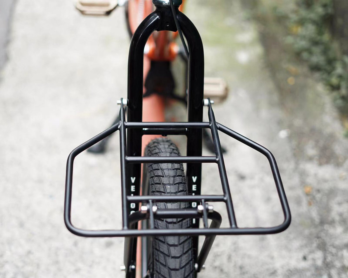 20インチの前輪に対応するよう設計されたNo.08は、従来のフォークよりもプラットフォームを低い位置に設定できる。これにより重心が効果的に下がり、走行中の荷物の安定感が増す。大きなバスケットや牛乳箱、郵便ポストも積載可能だ。もちろん、プラットフォームは取り外し可能なので、必要な時だけ装着できる。