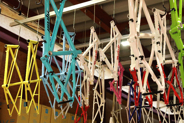 Tyrellのカラーオーダーシステムを支えるのは、粉体塗装のパイオニア「カドワキコーティング」。環境に優しく、耐久性・耐候性・防錆性に優れた粉体塗装技術で、美しいだけでなくタフなフレームを実現。一つ一つ丁寧に仕上げられるフレームは、まさに芸術作品と言えるだろう。