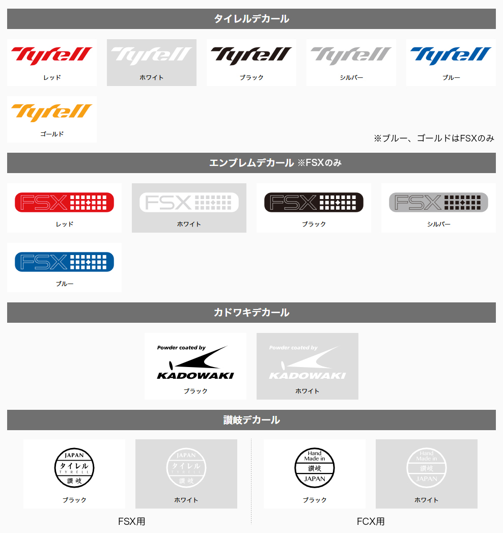 Tyrellロゴやエンブレムデカールのカラー、有無も選択可能。フレームカラーとの組み合わせを考えるのも楽しい。