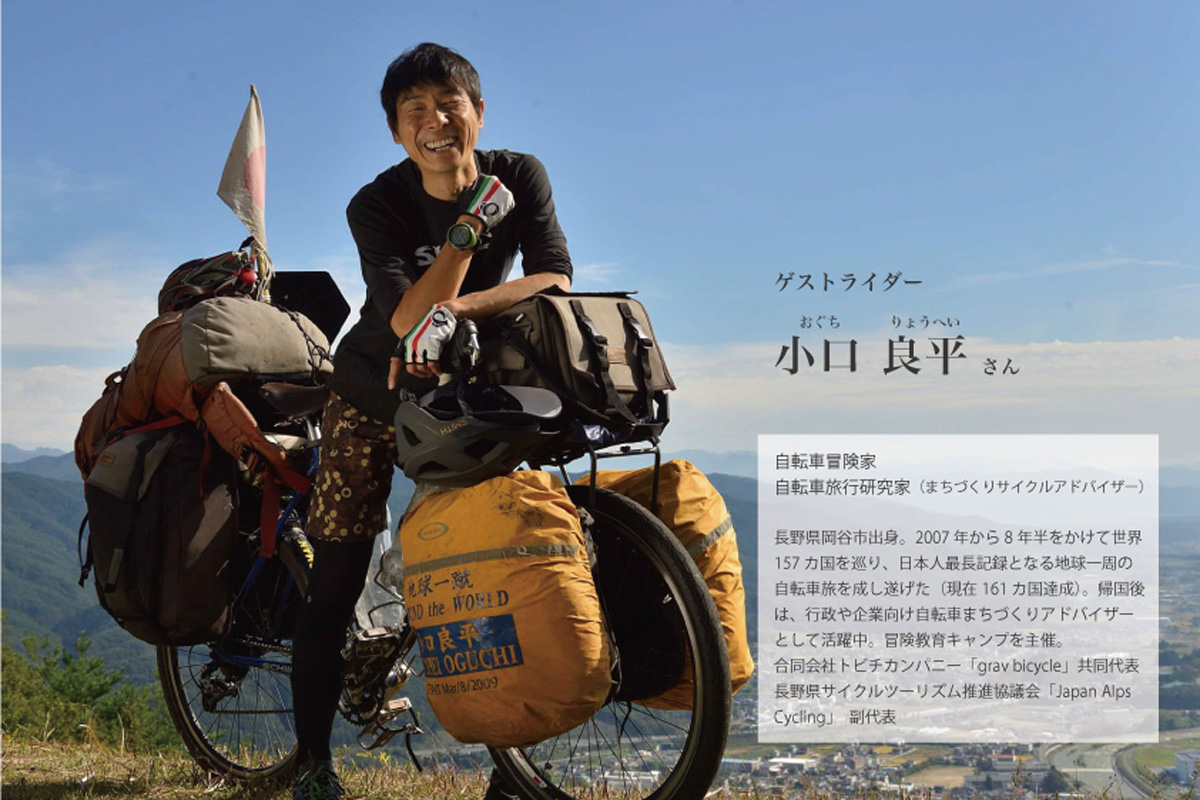 ゲストライダーとして、自転車冒険家の小口良平氏を迎える。小口氏は2007年から8年半をかけて世界157カ国を自転車で巡り、日本人最長記録となる地球一周を達成。現在は161カ国に到達し、行政や企業向け自転車まちづくりアドバイザーとして活躍している。