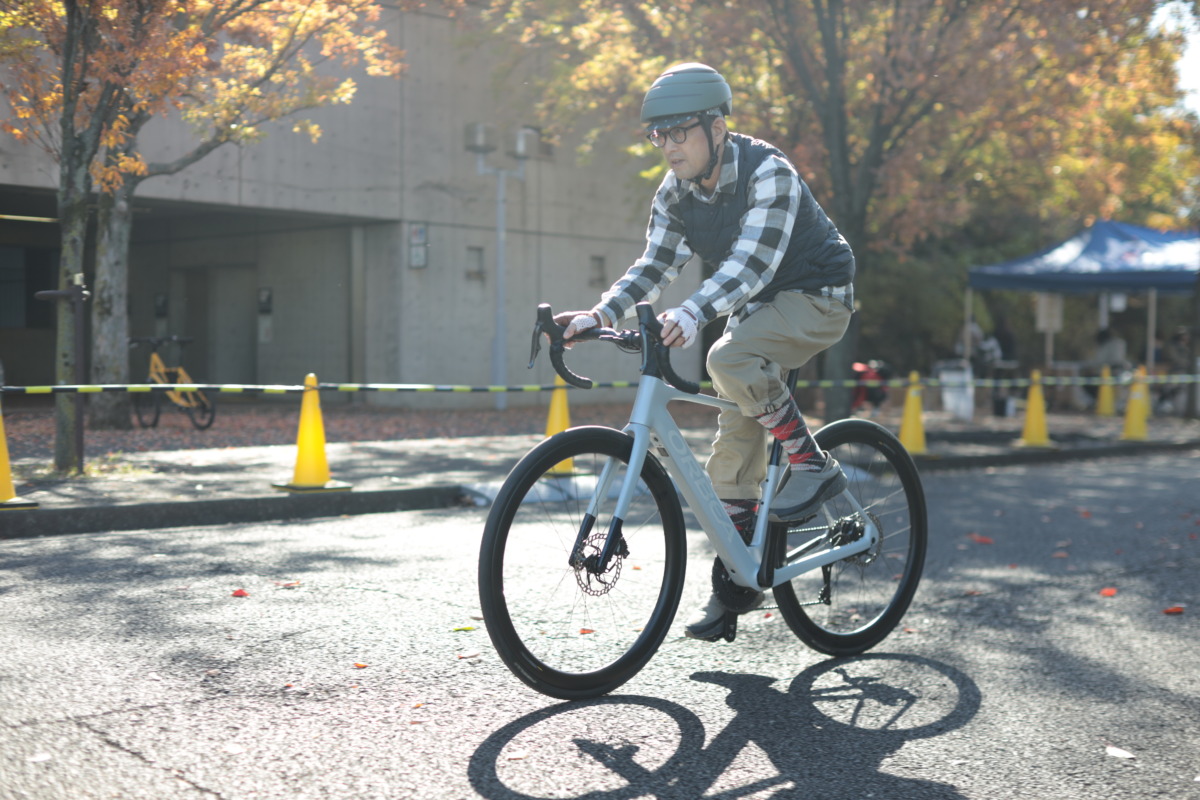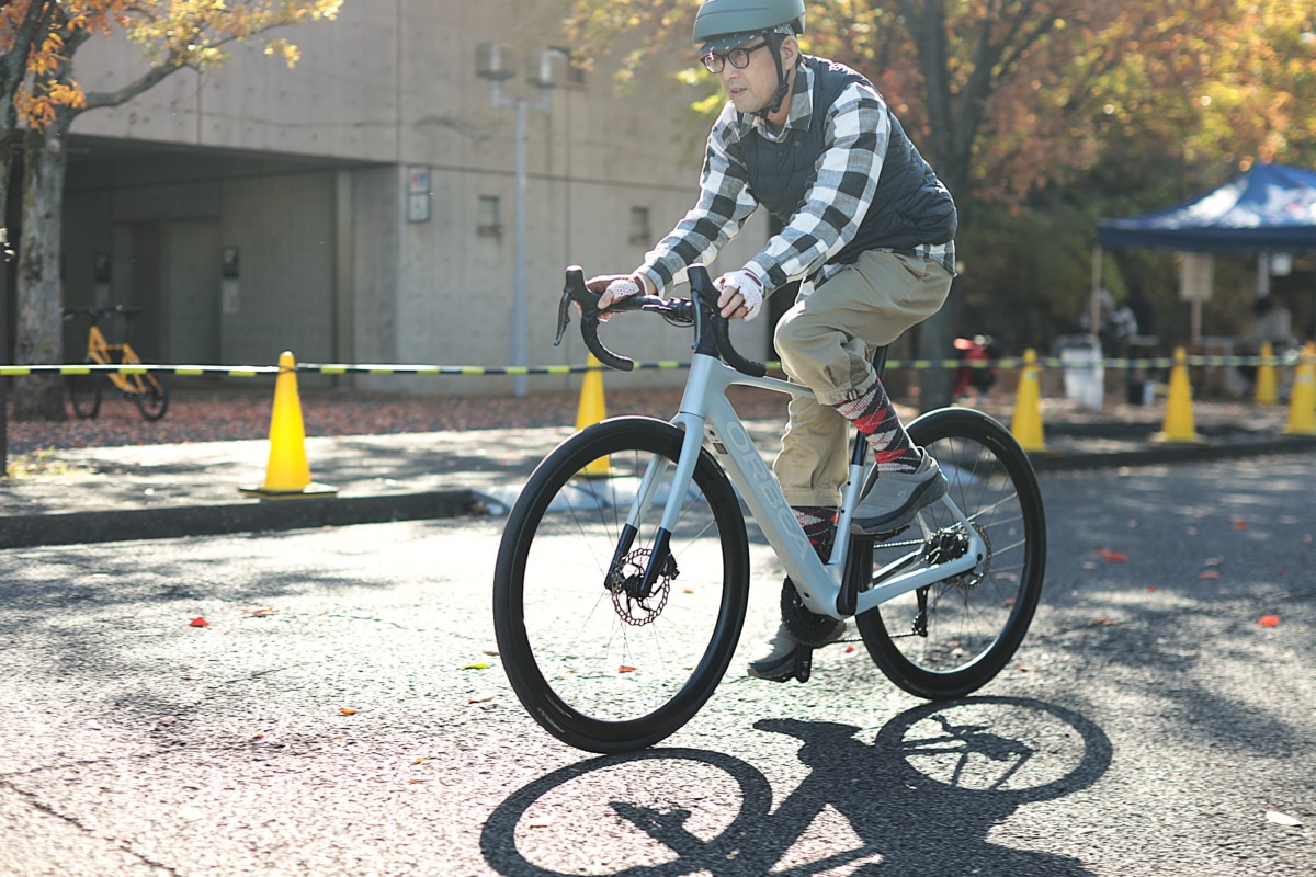 イベントの舗装コースで乗ってみると、まずその軽さに驚いた。アシストが効き始めると、「ロードバイクに乗っている感覚」のまま、ぐっと加速する。バイクが進む感覚が、ペダルを踏むタイミングとリンクしていて、違和感が少なかった。