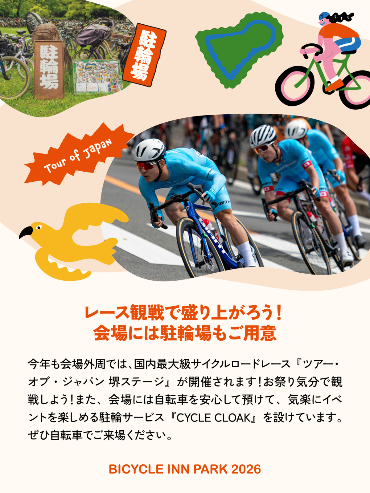 開催日である5月24日(日)は、大仙公園周辺を舞台に『ツアー・オブ・ジャパン(TOJ) 堺ステージ』が開催される。トップレーサーたちによるド迫力のレースを観戦し、そのままBICYCLE INN PARKで自転車に乗って遊ぶという、自転車好きにはたまらないサイクルを満喫できる。