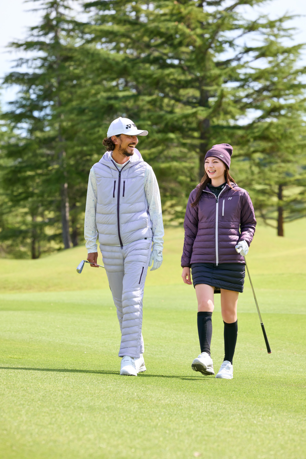 軽量で伸縮性に優れた「ソラトビ」素材を使ったペアコーディネートは、冬ゴルフにぴったりの一体感。メンズはワントーンでまとめたスタイルに中綿ベストをプラスして軽快な印象に。ウィメンズは中綿パーカーとニットキャップのカラーをリンクさせ、全体を黒で引き締めて洗練された印象に仕上げています。機能性とおしゃれ心を両立した、今季イチ推しのリンクスタイルです。