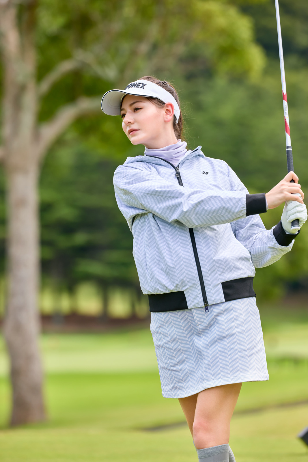 ヘリンボーン柄に「The view from one yard beyond(1ヤード先からの眺め)」というメッセージをさりげなく忍ばせた、遊び心あるフルジップパーカーとスカートのセットアップ。動きやすく、着脱もスムーズなパーカーは、気温差のある秋冬ラウンドで大活躍。統一感のあるコーディネートながらも個性を引き立ててくれる、見た目も機能も抜かりない一着です。