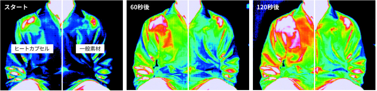 20度の温度設定で1mの距離からレフランプで500Wの光を照射した比較テストでは、わずか60秒後にはヒートカプセル側の衣服内温度が上昇しており、優れた暖かさを示しています。[ユニチカガーメンテック(株)実験データ]