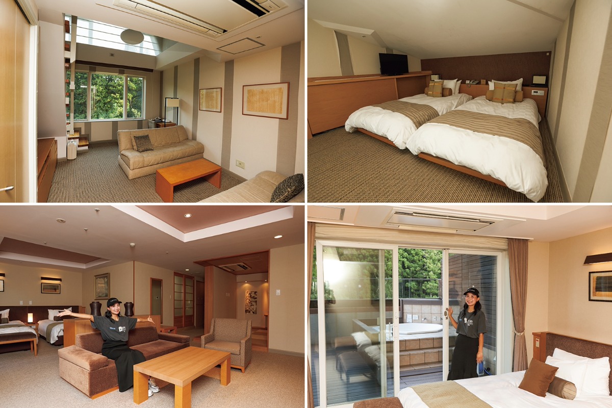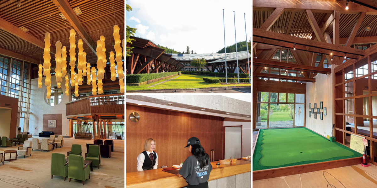 到着してまず驚いたのがクラブハウスの存在感。それもそのはず、国内最大級の木造建築なんですって。館内は天井がど〜んと高くて、開放感は抜群。そこかしこで木のぬくもりを感じるし、アメリカの著名なデザイナーが手がけたインテリアもお洒落で、高級ホテルの雰囲気です。実際、2階と3階はホテルになっていて、シンプルなツインルームから専用ジャグジー付きのスイートまで全30室を備えています。