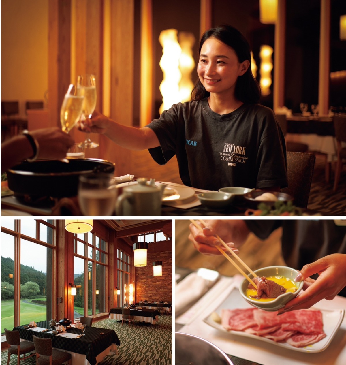 天然温泉で汗を流したら、お待ちかねの夕食へ。那須高原牛のすき焼き、美味しかったなあ。ライトアップされた18番グリーンを望む景観も素敵で、ラグジュアリーな気分を満喫させていただきました!