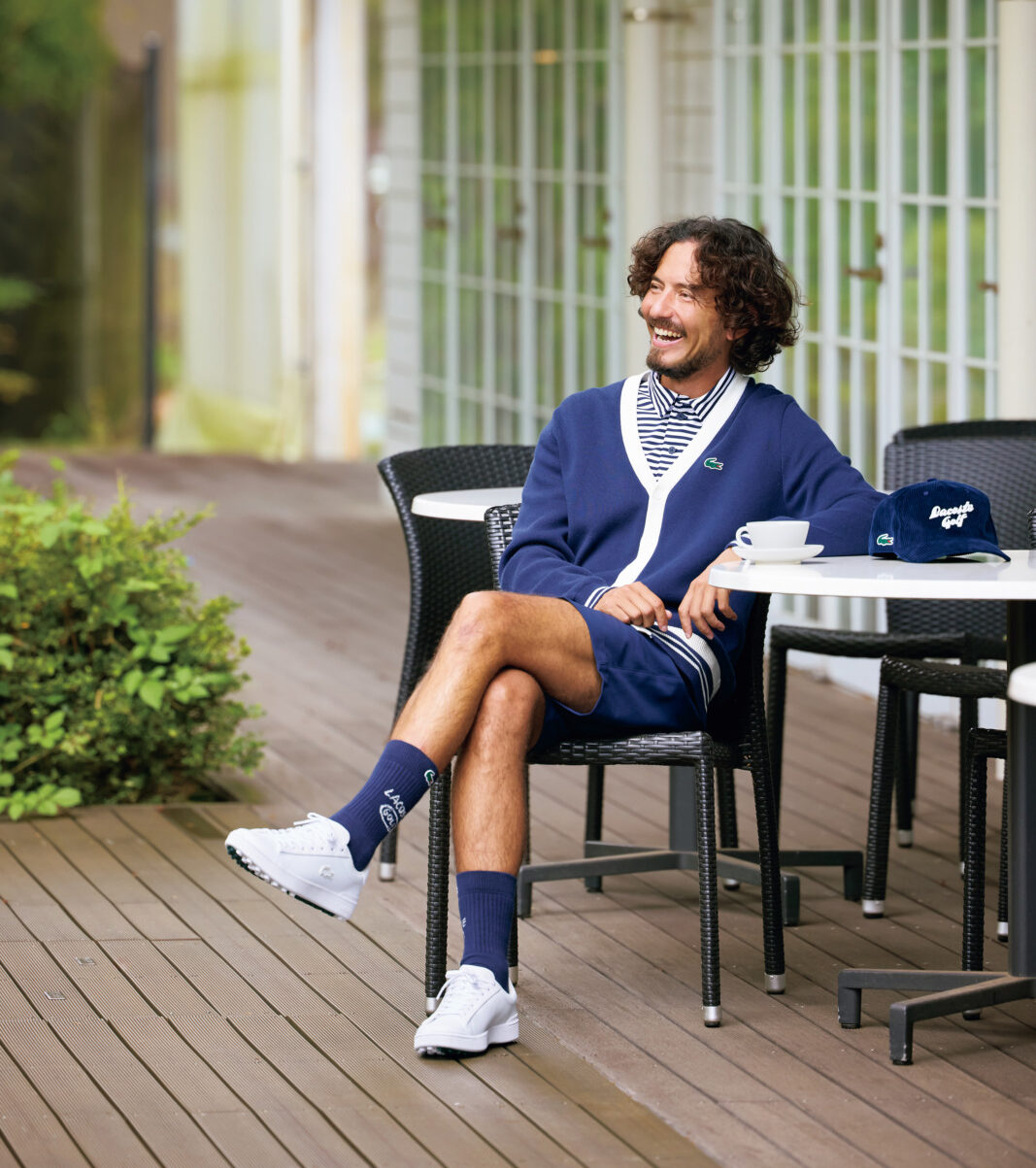キャップ11,000円、カーディガン26,400円(10月発売予定)、ポロシャツ17,600円、ショーツ19,800円、ソックス3,300円、シューズ15,950円(ラコステ問ラコステお客様センター)、その他スタイリスト私物
