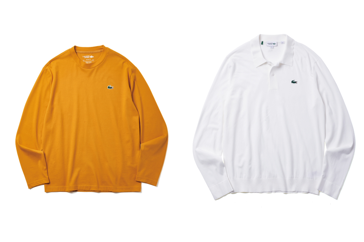 (左)柔らかな肌触りと伸縮性を備えたレーヨン×ポリエステルのストレッチジャージを使用したニットポロシャツ。20,900円