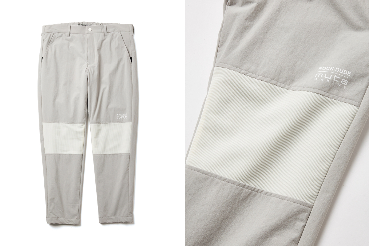 モデル着用パンツ(写真下)のカラーバリエーション。膝に伸縮性に富んだリブ素材を使用することで、可動に対するストレスを解消。52,800円。