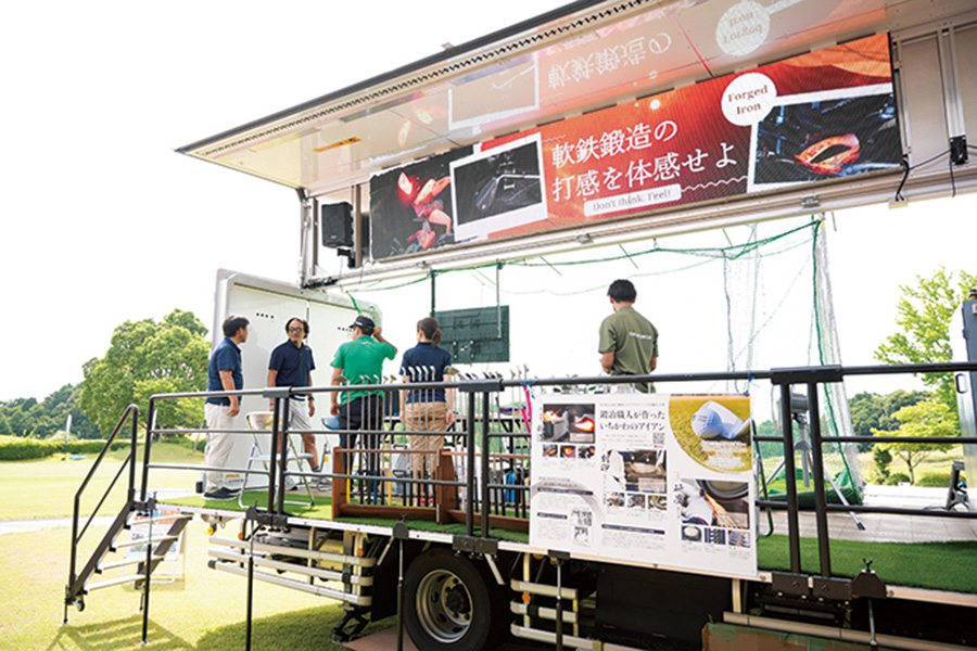 2025年7月の中旬、三重県「津カントリークラブ」で開催された「ムータマリン」のコンペにて不思議なトラックと遭遇。8t車の大きなそれは、荷台のウィングを跳ね上げゴルフの試打ブースを作り上げているのだった。第一印象は「なんじゃこれ」である。