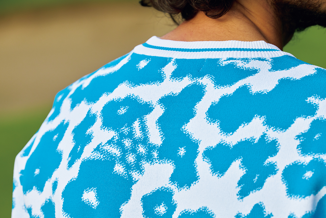 スポーティであることと同時にファッション性の高さも感じることができるのがこのブランドの特徴の一つ。印象的なグラフィックで目を引くのは、上質な素材感と清潔感が際立つニットスタイリング。サンバイザー14,410円、ニット56,100円、パンツ52,690円、シューズ48,620円(アニューゴルフ 問QandB Japan)、その他スタイリスト私物。