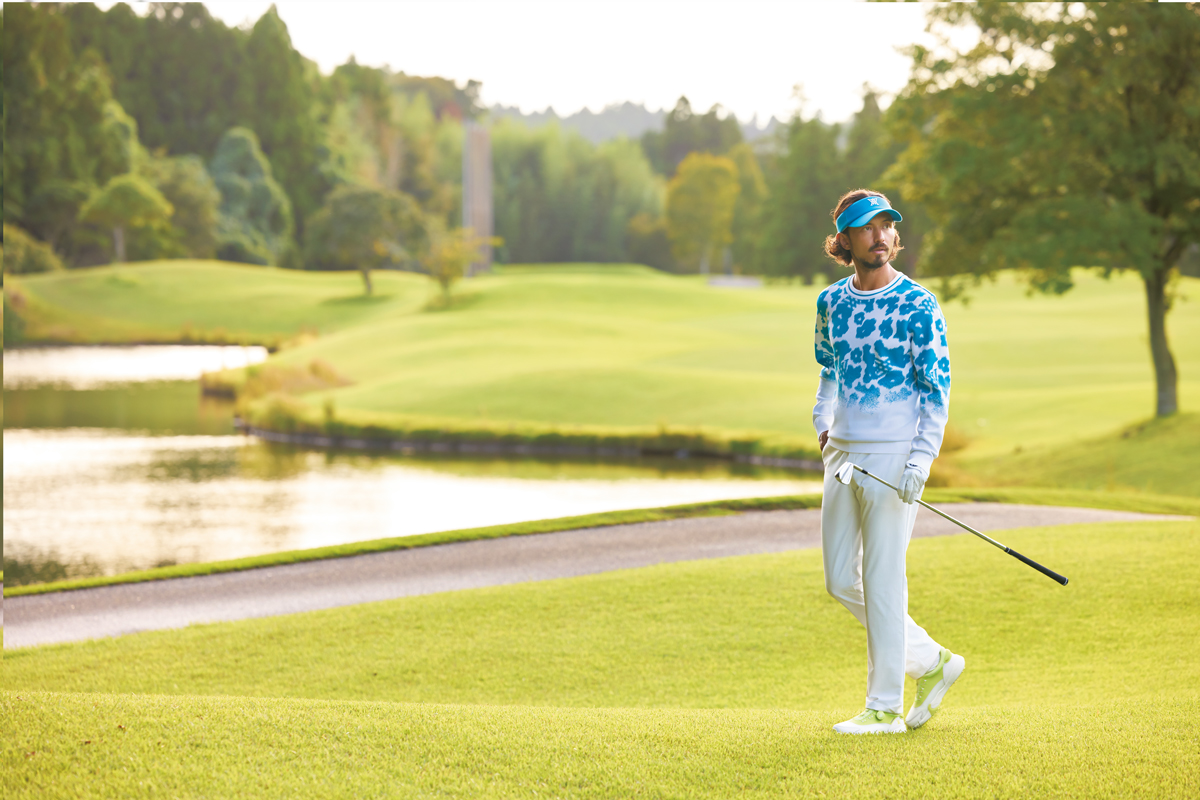 スポーティであることと同時にファッション性の高さも感じることができるのがこのブランドの特徴の一つ。印象的なグラフィックで目を引くのは、上質な素材感と清潔感が際立つニットスタイリング。サンバイザー14,410円、ニット56,100円、パンツ52,690円、シューズ48,620円(アニューゴルフ 問QandB Japan)、その他スタイリスト私物。