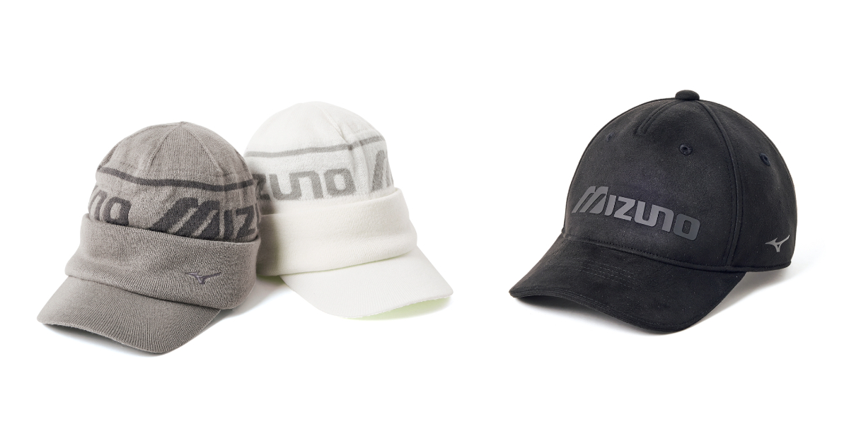 右:スエード調の素材に立体的な「MIZUNOロゴ」を配して大人のスタイリングを演出するキャップ。8,800円。