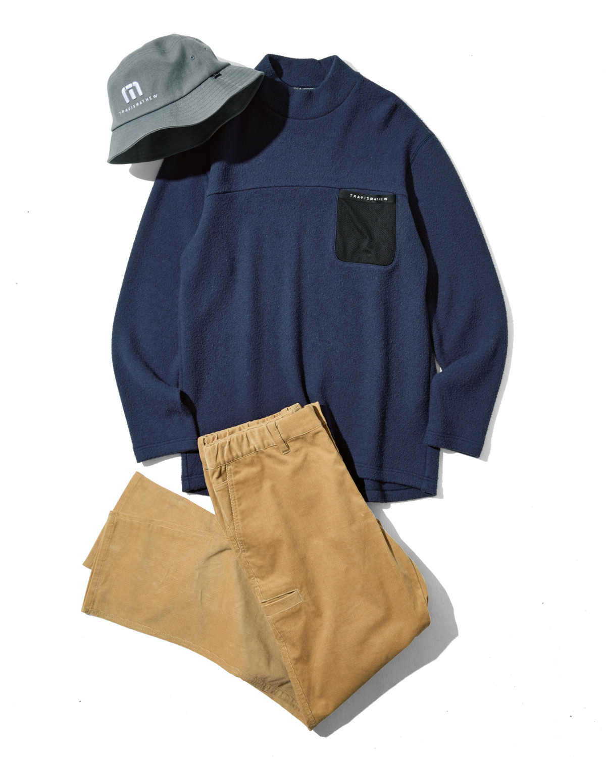 柔らかくウォーム感のあるフリース素材のモックネックは、左胸にメッシュポケットが付きラウンドでも便利な仕様。地厚なコットン素材を使ったバケットハット、適度な光沢感とハリ感のあるコーデュロイパンツと合わせれば、西海岸を感じさせるアメカジ風のリラックスしたゴルフスタイルを楽しめる。