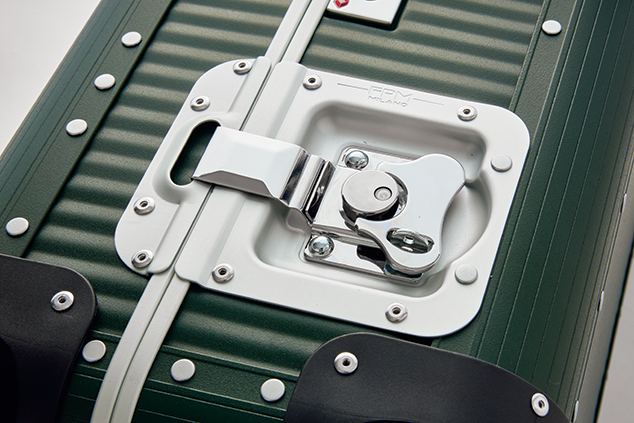 なんといってもその見た目。アルミニウムのパネルにリベットが打ち込まれたボディは、ミニマルでスタイリッシュ。無機質な雰囲気と渋めのモスグリーンが相性抜群だ。組み合わされるレザーハンドルのカラーを選べるのも遊び心があるし、金属プレートを回して鍵を開閉する「バタフライロック」のメカニカルな操作性も男心をくすぐるなあ。