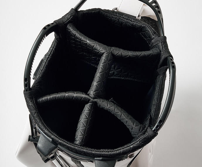 クラブも小物もスマートに収まる。マグネット開閉や多機能ポケットなど、気の利いた仕様が“使えるギア”を演出。各種ヘッドカバー9,900円、カートバッグ30,800円。