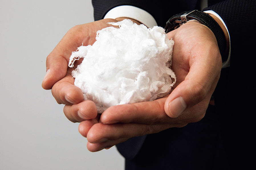 TEXIFILは端的に言えば、ポリエステルを原料にした極細繊維ナノファイバーを独自技術で厚みのある(約1.6ミリ)シート状に加工したものだ。一本が髪の毛の約120分の1という超極細の繊維径のため、ダウンや一般的な機能性中綿に比較し、同じ分量でより数多くの微小な空気ポケットが生じる。ゆえに、保温性はそのままに、従来の防寒ウエアよりも薄く、軽量で、蒸れにくく、原材料の選定次第ではストレッチ性や防撥水などの機能性も付与することができる。樹脂なので家庭で洗濯も可能だ。