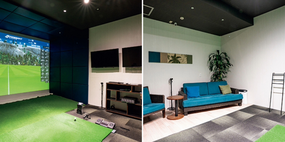 ゴルフレンジ後方には、ゆったりと寛げるソファースペース。ゲストを招いてのラウンドや練習も楽しむことができる。