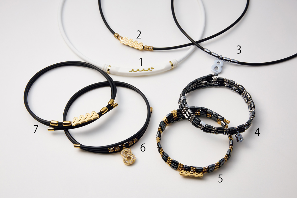 「muta MARINE」のアイコンであるウェーブやNo.8をデザインした磁気ネックレスは効果の高い管理医療機器認証を取得している。価格【1】13,200円、【2】【6】38,500円、【3】【7】26,400円、【4】【5】88,000円