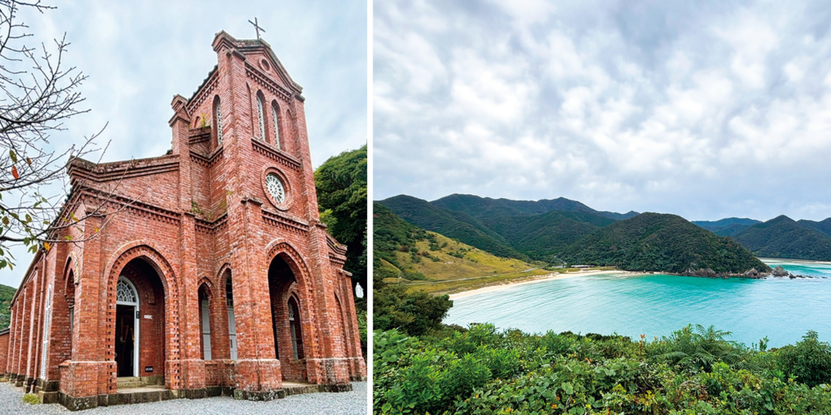 五島のシンボル的教会「堂崎教会」や白い砂浜と透明度の高いエメラルドグリーンのコントラストが美しい「高浜海水浴場」など、島内に点在する観光スポットを巡る楽しみも。