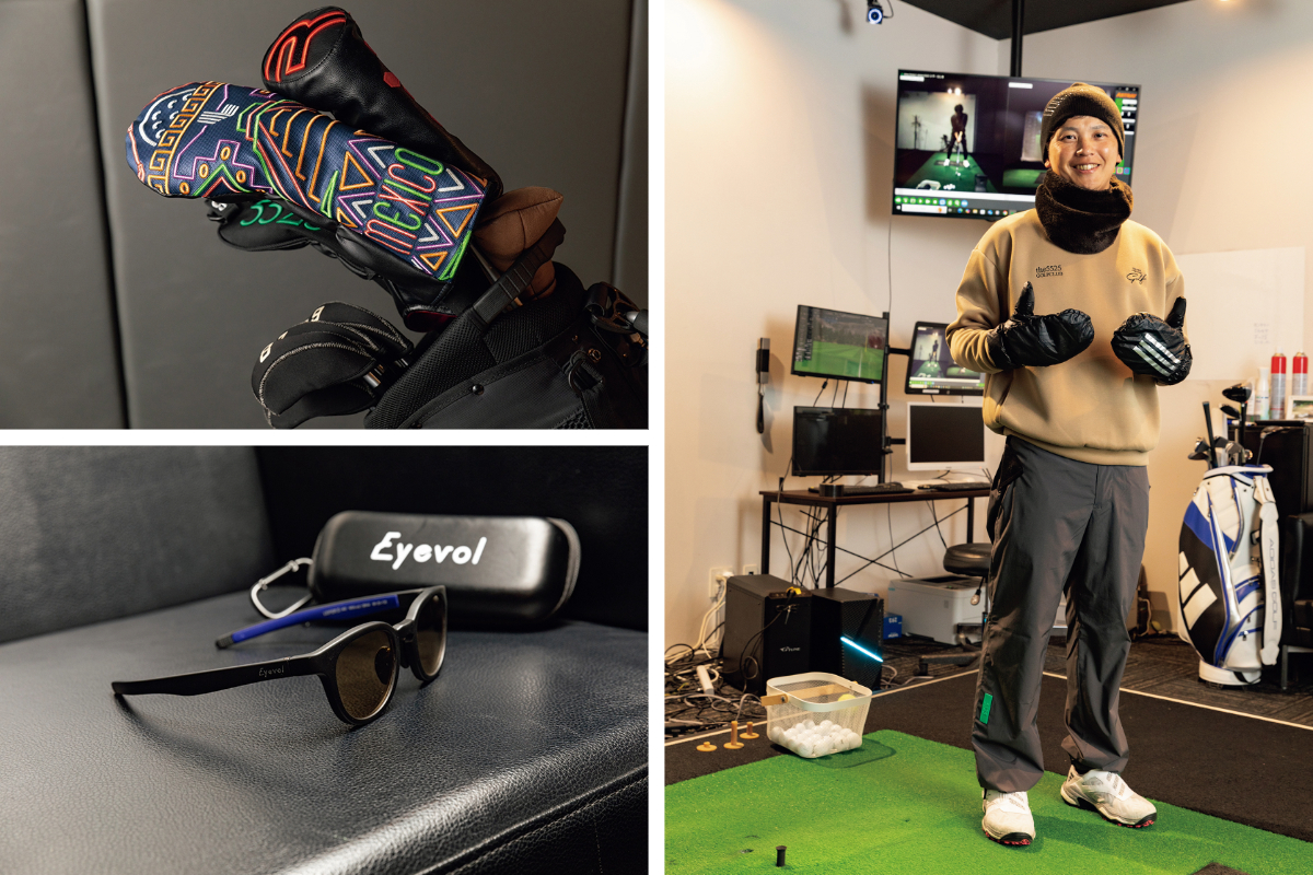「選手がシーズンオフとなる冬にテストを兼ねてラウンドする機会が多く、自分でクラブを握らない日もあるので防寒にはこだわりますね」。内側にインナーダウンを忍ばせた「5525golf」×「UA」のダンボールニット、「UNIQLO」のネックウォーマー、ミトンの完全防備だ。