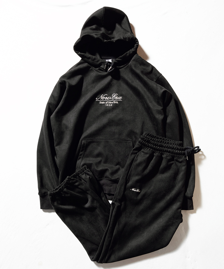 スエード調の風合いで着心地の良いセットアップは「NEW ERA」。ホームコースへの往復に着用。