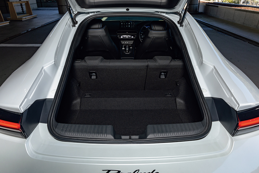 プレリュードは燃料タンクとバッテリーを搭載するハイブリッドカーなのですが、リアハッチを開けて2+2のシートの後席を倒せば、前輪駆動ならではの凹凸の少ない広くて使いやすい荷室が広がります。