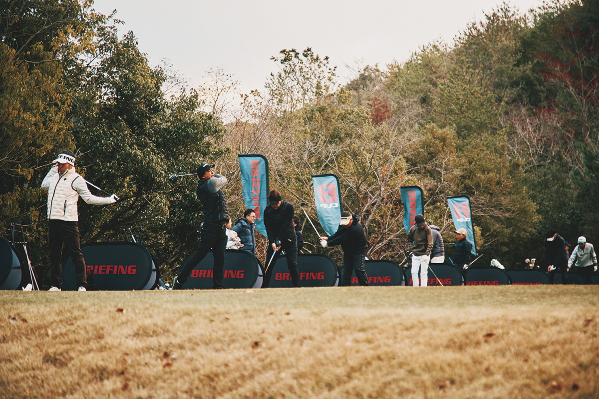 BRIEFINGのフラッグが立ち並ぶ練習場では、各自が弾道、距離感、リズムを納得いくまで確かめていた。