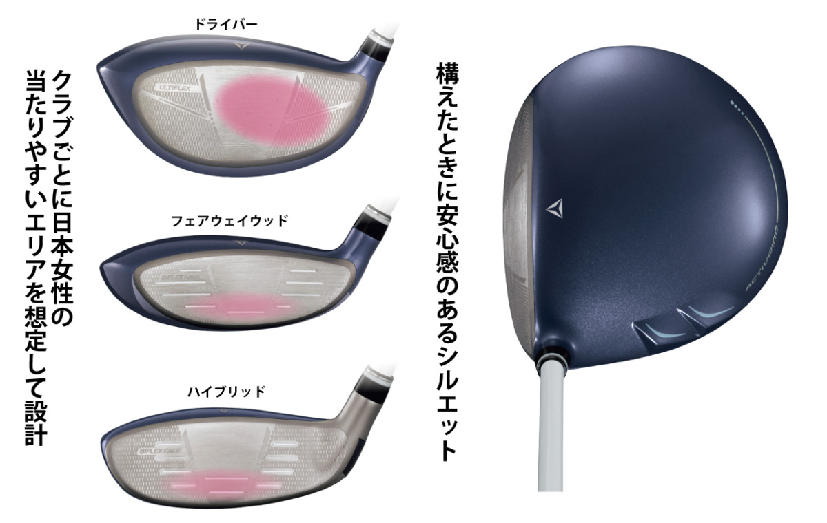 丸みがあり、レディスクラブの長さでも大きく見えすぎないシルエット。ヒールに当たりがちな女性の打点エリアを薄くし、ボールがより弾いて飛ぶ設計。女性のパワーでもボールが上がり、心地よく響く打球音など、細部にまでやさしさにこだわっている。