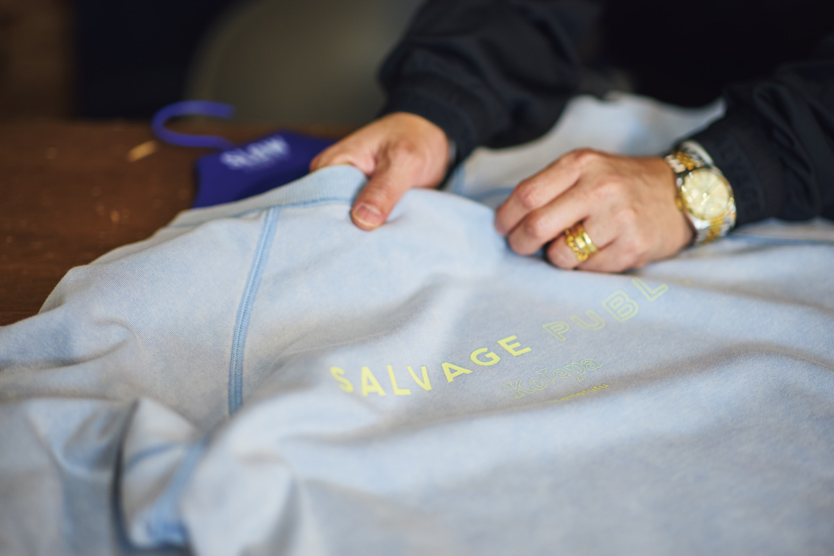 背中に大胆に配したダイアモンドヘッドロゴが視線を集める。SALVAGE PUBLIC Kolepaらしいアイコン性で、後ろ姿まで語れる一着。