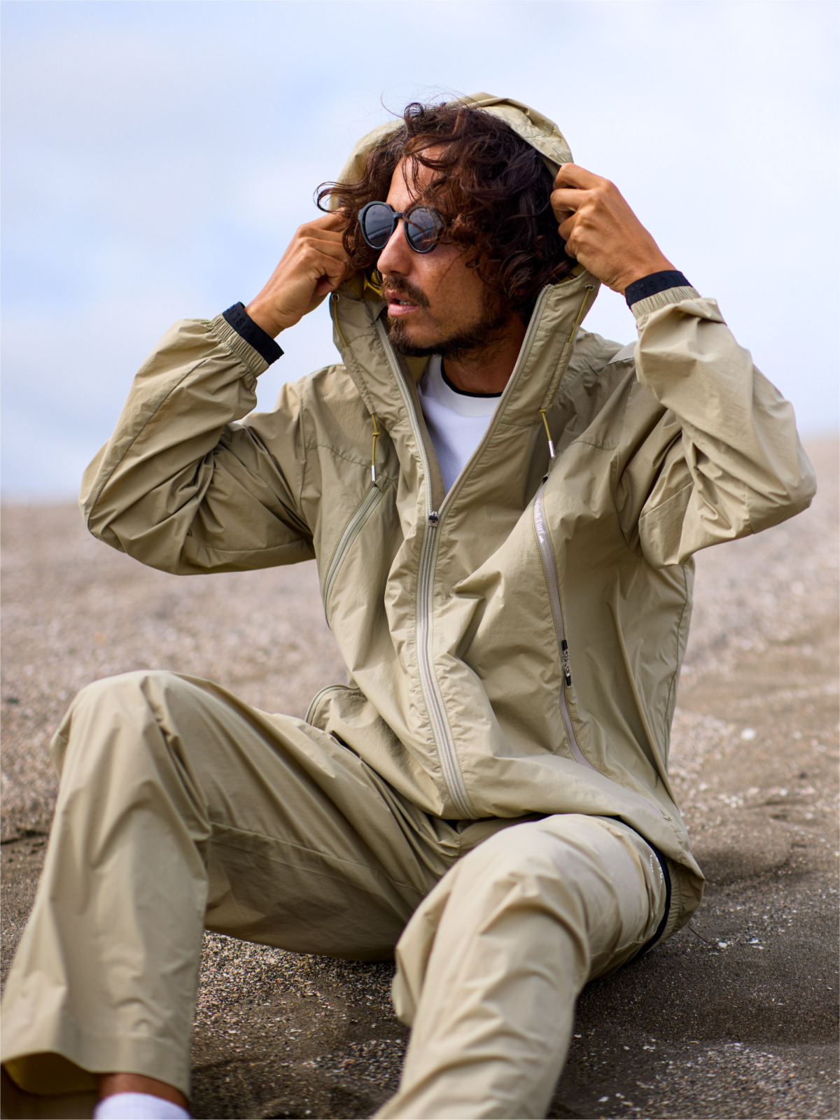 突然のスコールが日常のハワイで鍛えられた、全天候対応のナイロンセットアップ。軽量で高い撥水性と、その持続性を誇る『ダントツ撥水®』素材を使用し、雨風を防ぎながら快適な着心地をキープ。立体フードや多機能ZIPポケット、動きを妨げないトラウザーズ設計など、プレー視点のディテールが充実。天候やシーンを選ばず活躍する万能な一着。