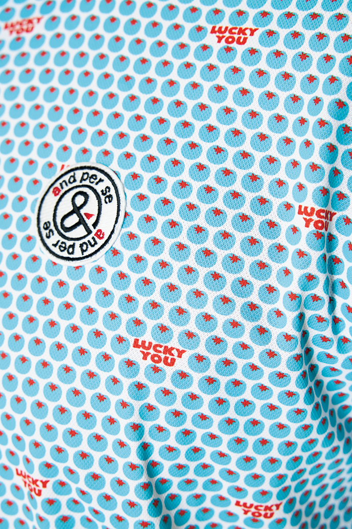 小柄のトマトプリントポロシャツの存在感に負けず劣らず、機能性に富んだ好発色のアイテムを合わせて、パッと目を引くブライトカラーのスタイリングに。今シーズンはカラフルなキャディバッグも登場。サンバイザー¥6,600、ポロシャツ¥11,000、パンツ¥13,750、ベルト¥11,000、キャディバッグ¥49,500(すべてアンパスィ)、その他スタイリスト私物