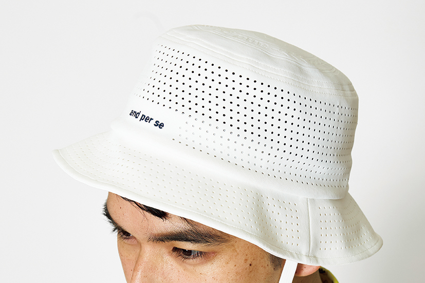 トレンドアイテムのバケットハットには、通気性を高めるパンチング素材を使用。清潔感のあるホワイトと相まって、爽快な印象に。