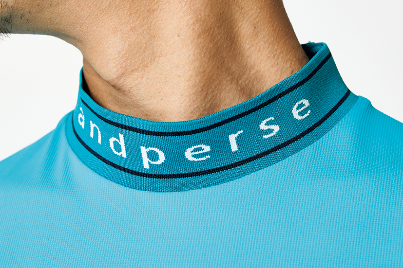 首元のフォルムをキッチリとキープしてくれるリブ襟に、ブランドロゴとラインを配してスポーティ感を演出したディテール。