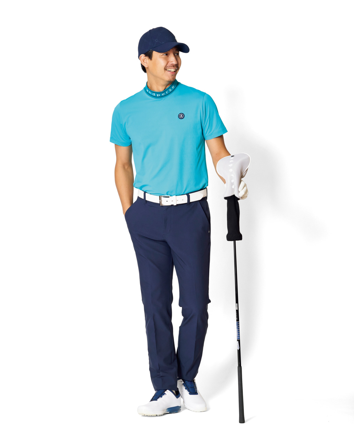 シンプルなモックネックシャツをメインとした王道コーディネート。キャップ&パンツで統一感を持たせつつ、キレイなレトロブルーがゴルフ場で映える『NAVY EDITION』による大人のスポーティスタイル。キャップ¥9,350、モックネックシャツ¥23,100、パンツ¥22,000、ベルト¥13,200、ヘッドカバー[DR]¥7,700(すべてアンパスィ)、その他スタイリスト私物