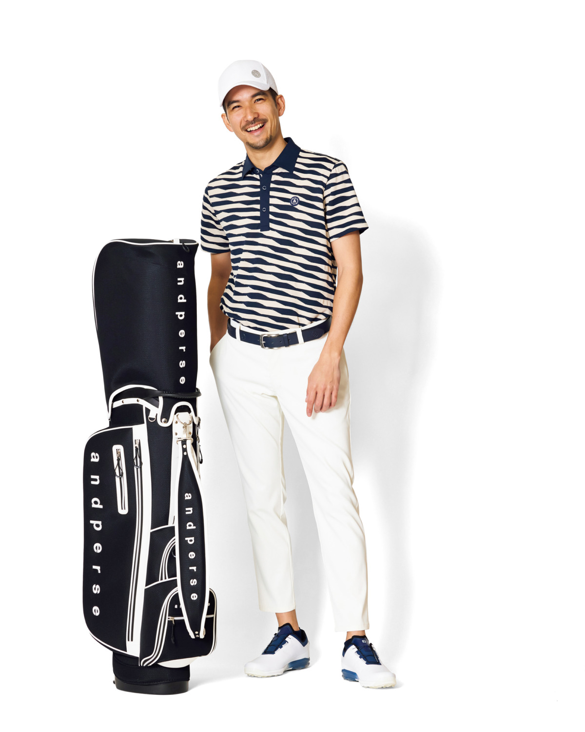 キャップとパンツは。アクセントが効いたゼブラ調のポロシャツ。キレイ目なホワイトを合わせてシックにまとめた『NAVY EDITION』のスタイリング。今シーズンはスタンド式キャディバッグにブラックカラーが登場。キャップ¥9,350、ポロシャツ¥26,400、パンツ¥19,800、ベルト¥11,000、キャディバッグ¥53,900(すべてアンパスィ)、その他スタイリスト私物